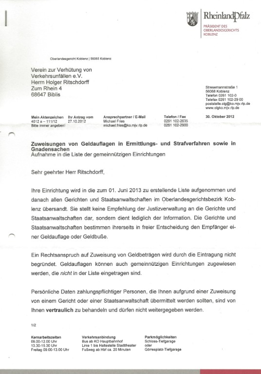 Aufnahme in die Liste für Bußgeldzuweisungen beim OLG Koblenz: